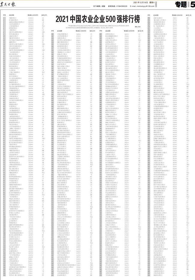 《農民日報》是我國歷史上第一張面向全國農村發行的報紙,是一份中央級、綜合性大報。2018年以來,農民日報社連續推出四屆中國農業企業500強榜單。2021年榜單參照國際通行評價辦法,由企業按照要求進行申報或采用公開數據,依據2020年農業企業營業收入排序產生,500強企業2020年營收范圍在12.47億元~5303.05億元之間。